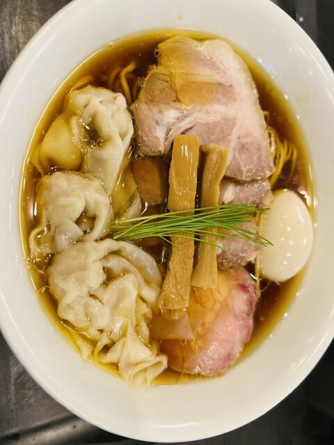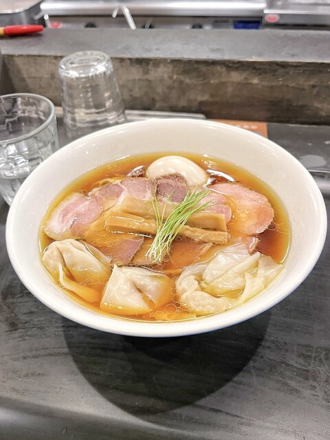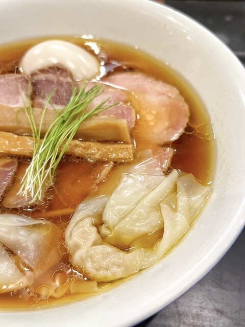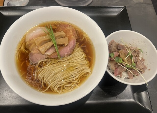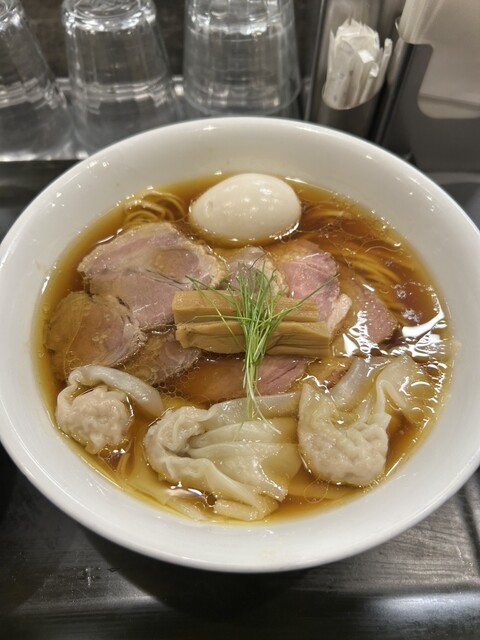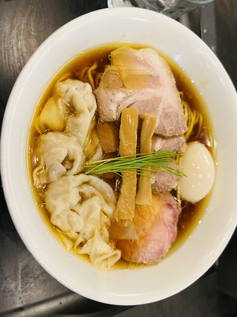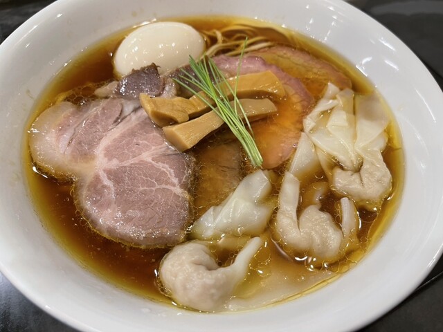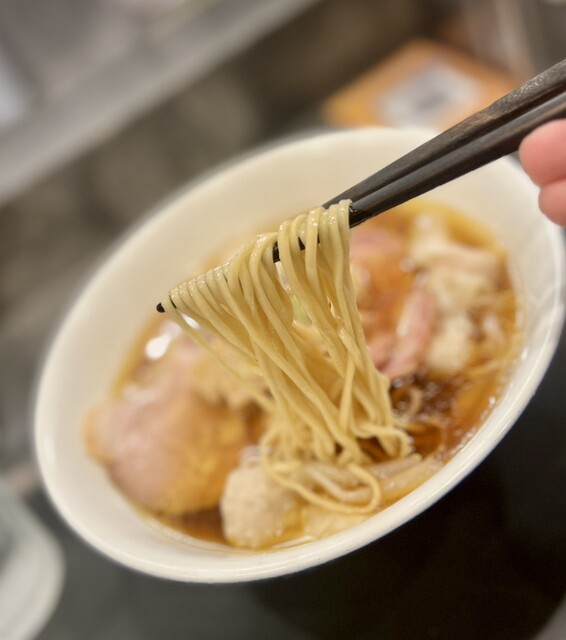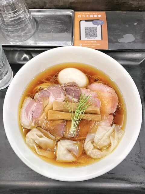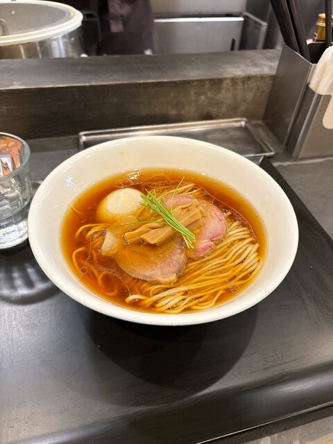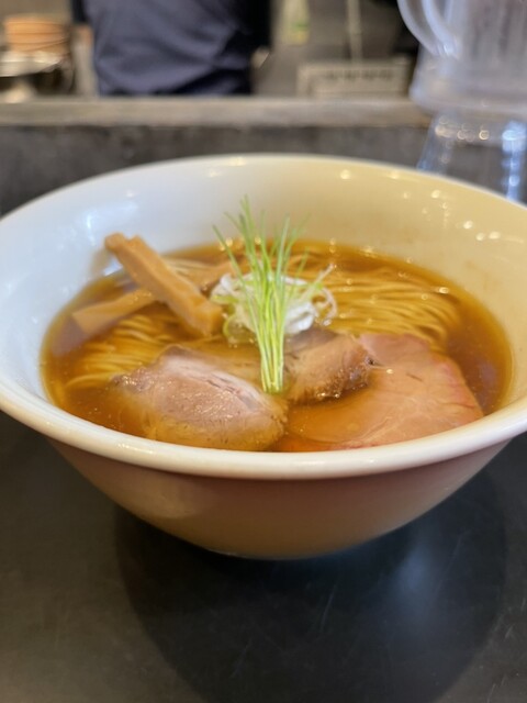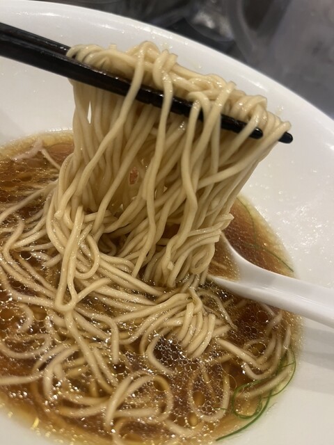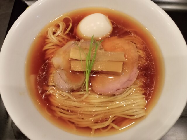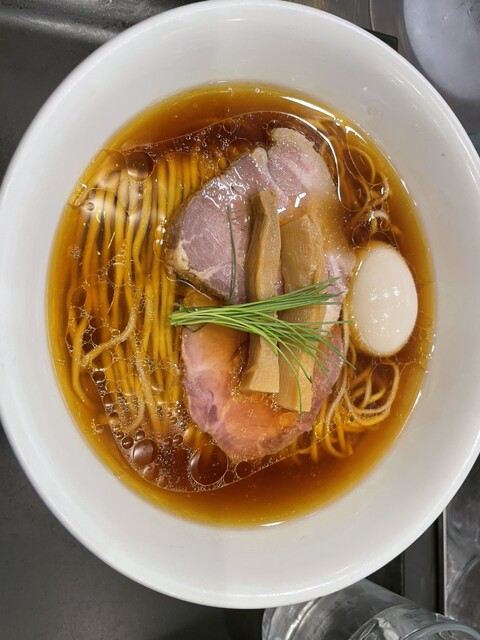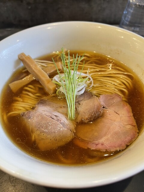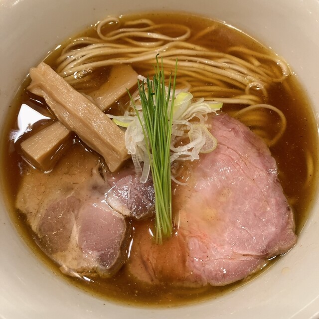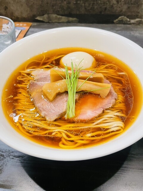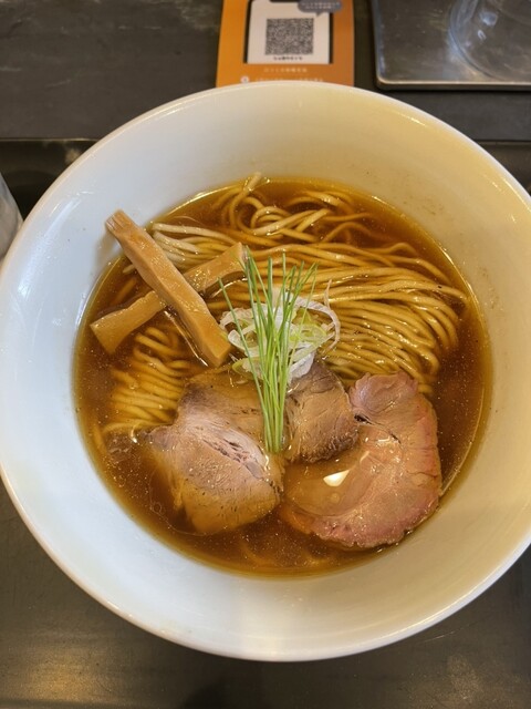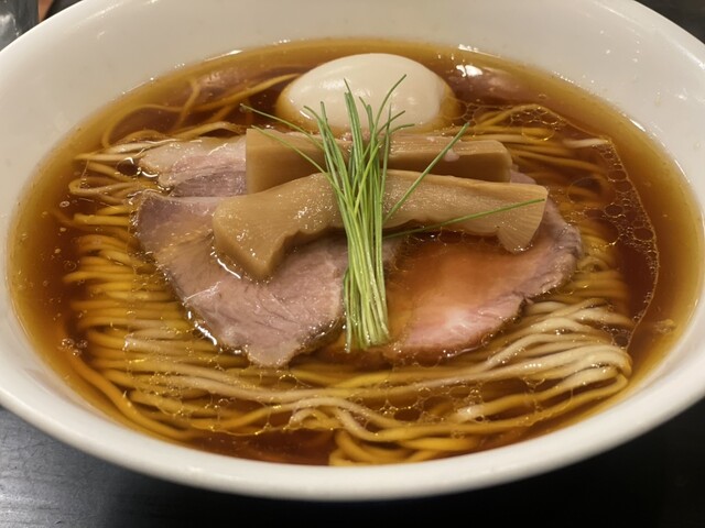 透き通る琥珀色のスープに中細ストレート麺、丁寧に盛り付けられた具材、美しいです。