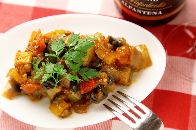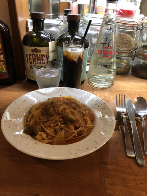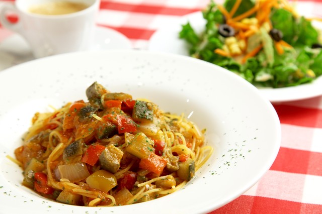 ①夏野菜のトマトソーススパゲティ (by オガミ イットウ)