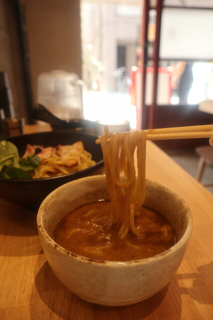 結論、程よく辛めの濃厚なつけ汁に太い麺が絡まって非常に美味しかったです。