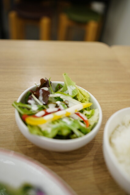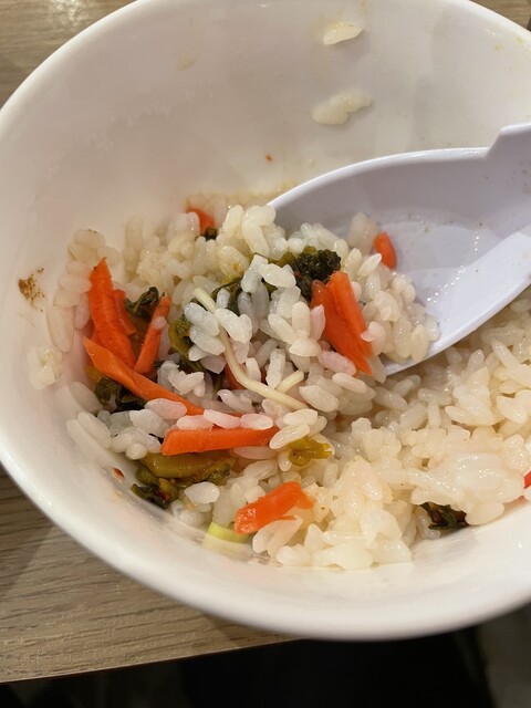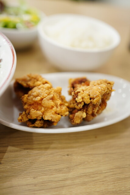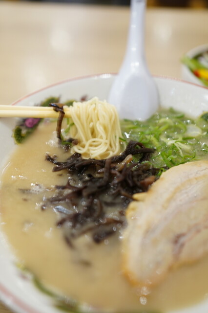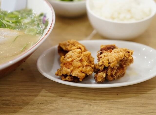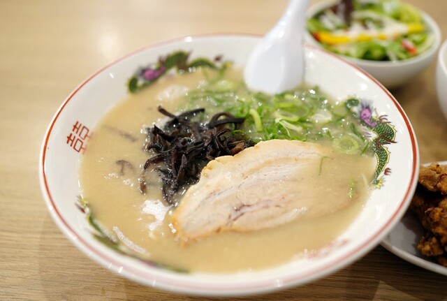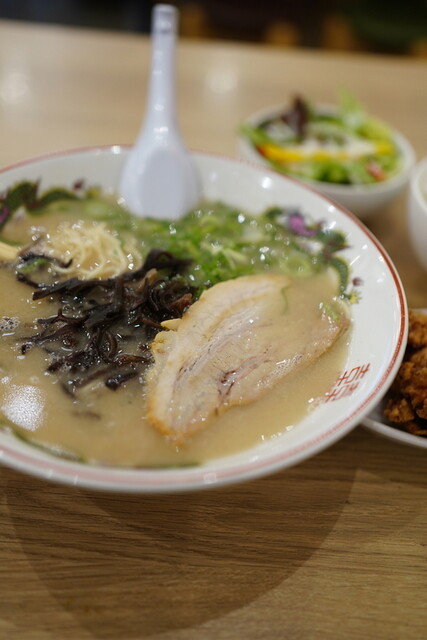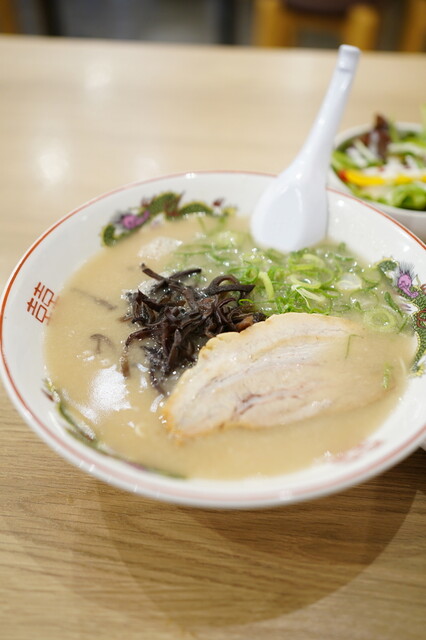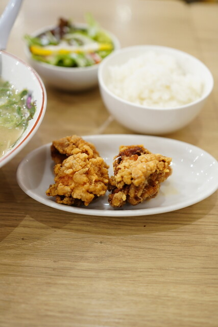 はじめにライスとサラダが供され、5分ほどでラーメンと唐揚げが運ばれてきま...