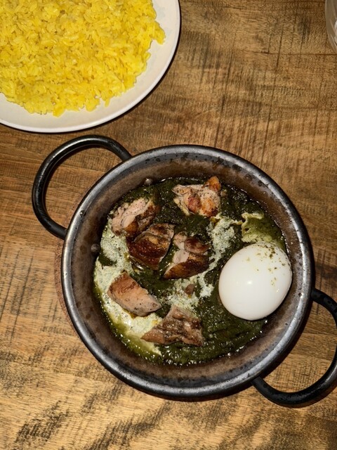 カレーtokyo百名店、鉄板の上の熱々の無国籍ほうれん草サグカレーが人気。