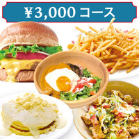 1. 選べるハンバーガー or ロコモコ 2. ポテト 3. チキンサラダ 4. マカダミアナッツソースパンケーキ フルサイズ1枚 ★コースご利用の方は 【 +1,980円でドリンク飲み放題 】に変更可能!