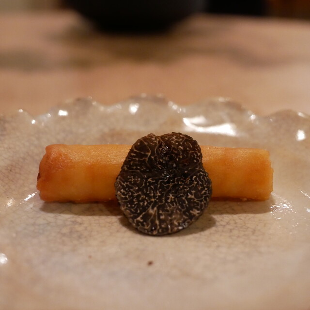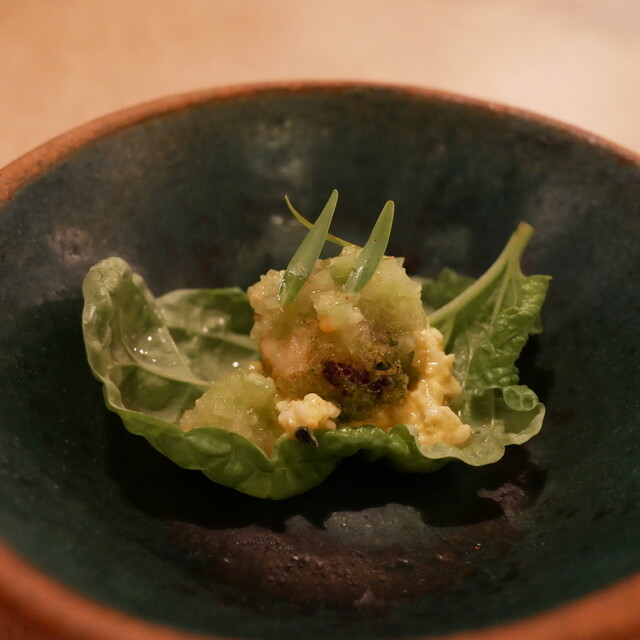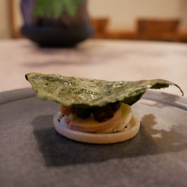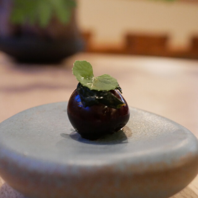 干瓢巻きの具材、”あん肝&バナナ”をはじめ、折々のフルーツを重ねた各皿は、その美しい調和も特徴的。
