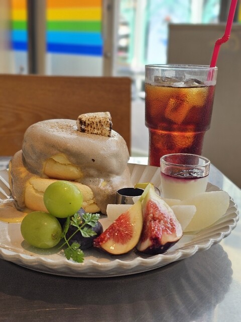 表参道の「レインボーパンケーキ」。祝日に予約をして訪問しました。いただいたのは季節限定の「ミルクティーと秋のフルーツたちのパンケーキ」。ふわふわの生地に、香り高いミルクティークリームと旬のフルーツがた...
