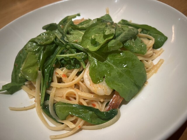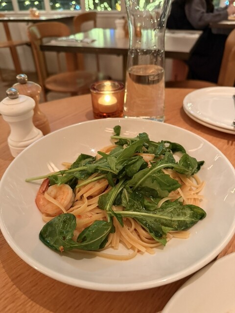 注文はエビとルッコラのリングイネを注文...