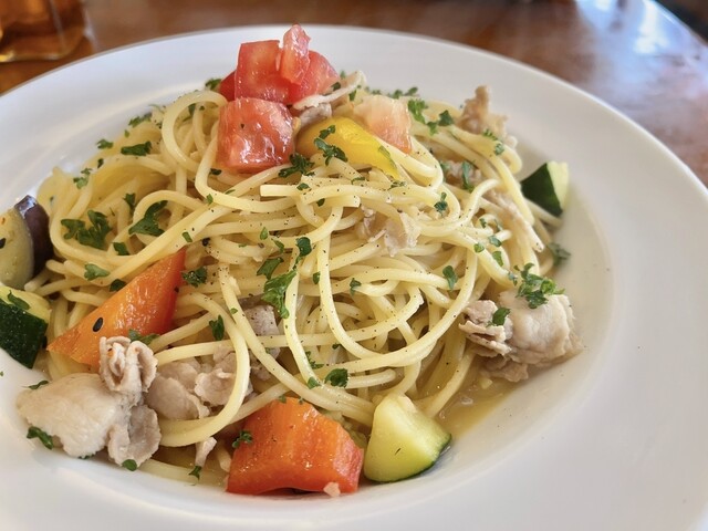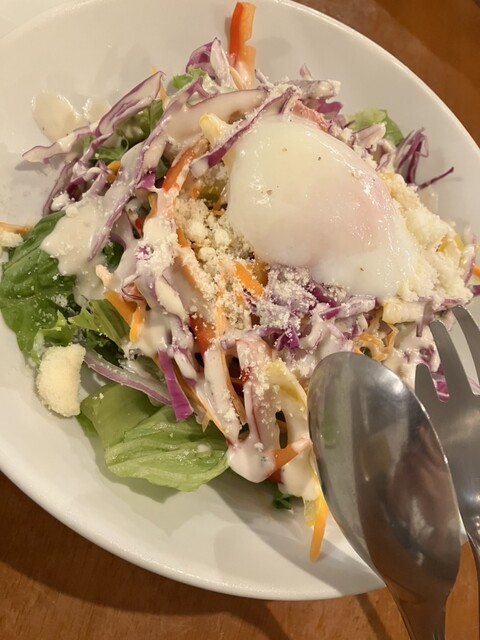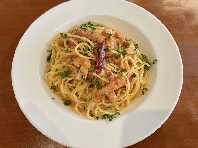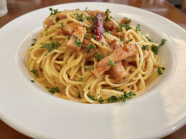 パスタランチの通年メニュー「サーモンとほうれん草のクリーム」(税込み1100円、大盛り無料、14時以降でアイスコーヒー無料)、ミニサラダ追加50円。 サーモンとほうれん草がいい香りです。粉チーズでコクが増し、ブラックペッパーがいいアクセントに。クリームソースはスープ状で最後までいただきました。 ... 詳細を見る