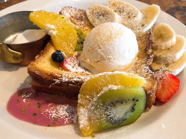 こだわりのブリオッシュを使い丁寧に焼き上げた”ふわとろ”食感のフレンチトースト、お花のミルクティー”フェアリーズティー”などドリンクも充実!パスタ、サラダ、アルコールもご用意しております。モーニングからディナーまで、開放的な店内でゆっくりとお過ごしください。