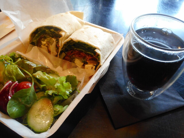 お目当てはホットチョコレートだが。こちらにはなくて向かいの店。それで店内でコーヒーを。さらにベジーラップを持ち帰りで。あまりに混み合って。落ちついて食事するのが。気が引けるので。フラワーショップ併設のカフェ。どこもこういう感じで。