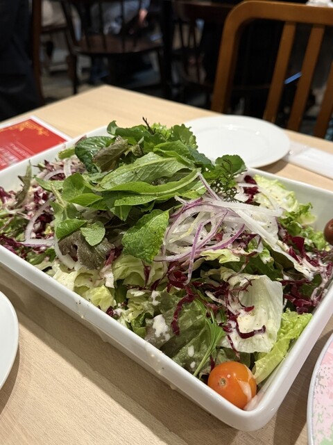 続いて出てきた大きなバットにたっぷり盛られたサラダは想像以上のボリュームで、野菜の鮮度も良く、ドレッシングとのバランスも抜群でした。