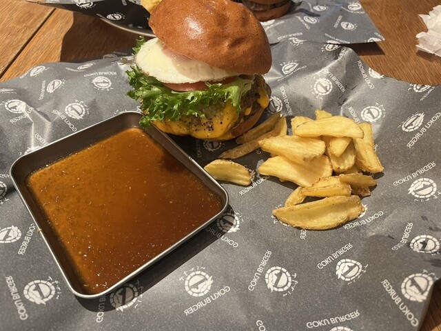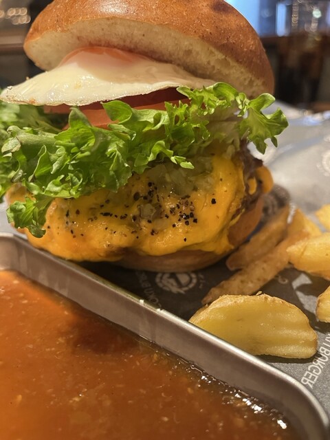 休日ちょっと遅めのお昼ごはんに。ランチタイムを外してもお店の外には行列が。15分ほど待って着席。人気っぷりを感じました。お店は2階にあって、窓際のテーブル席なら表参道の通りが見下ろせます。1〜2人なら中央のカウンター席に案内されることが多そうです。店内は外国の方も多くて、とても賑やかで国際的な雰囲気も感じました。アボトマチーズバーガーをオーダー。トレーにはハンバーガー、ポテト、ソース、そして黒いゴ...
