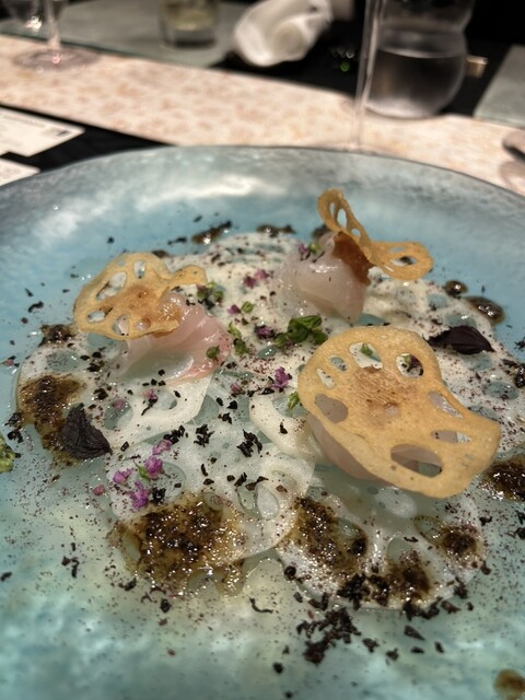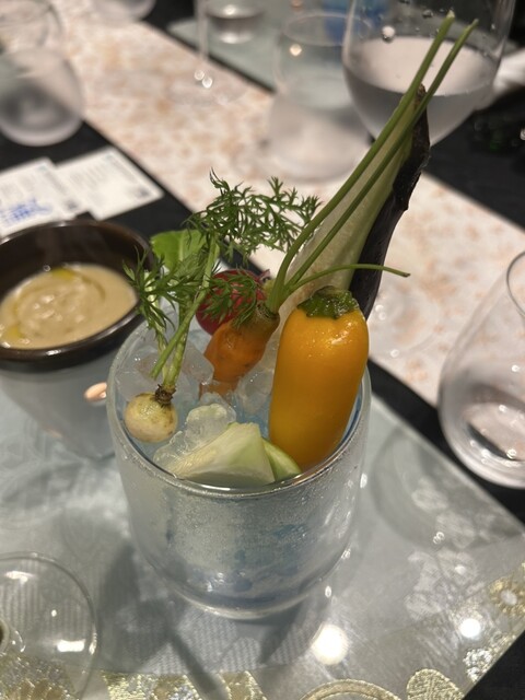 まず登場したのは、この店の象徴ともいえる「旬野菜のバーニャカウダ」。氷を敷き詰めた器から、まるでブーケのように立ち上がる色鮮やかな野菜たち。にんじん、ラディッシュ、葉もの野菜、それぞれが新鮮そのもので、口に含めば土の恵みをそのまま...