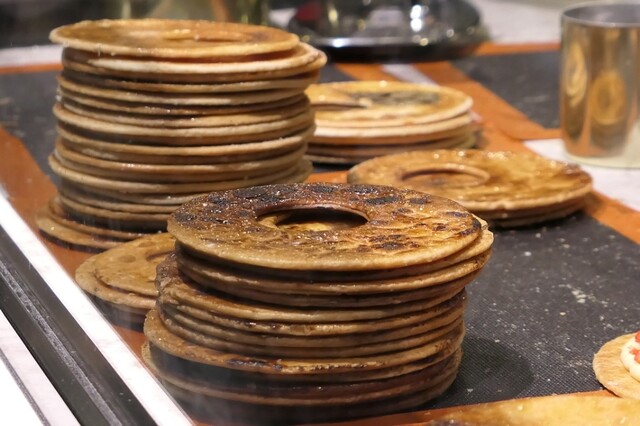 店内で大きな円になったパイ生地を焼き上げ。