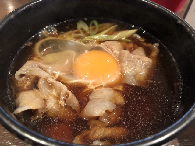 大きな器に盛り付けられた、細いお蕎麦。その隣には、器も熱々なつけ蕎麦のつゆ。熱々の肉汁には、お肉が2倍入った肉肉バージョンのため、しっかり食べ応えがあります。中に入った生卵は、途中で蕎麦に絡めると、いい感じで楽しめます。