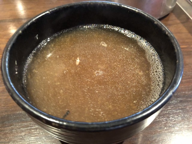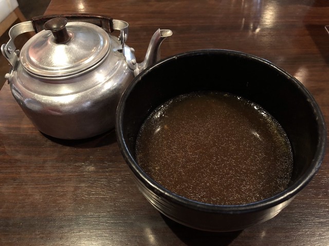 蕎麦を食べ終えると、小さいサイズのやかんで蕎麦湯を持ってきてくれます。つゆにたっぷり注いで、〆にスープ割りをいただきました。