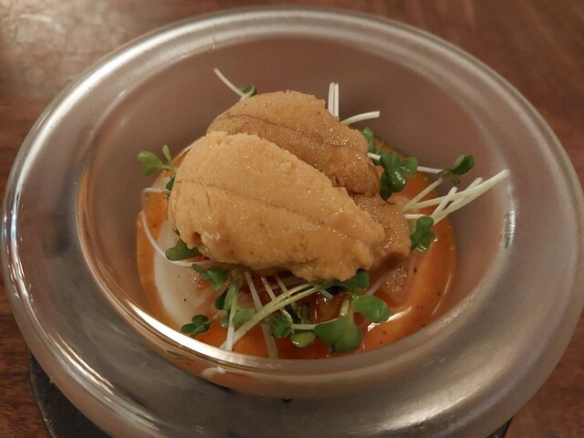 焼ホタテの上にウニジュレとウニの刺し身