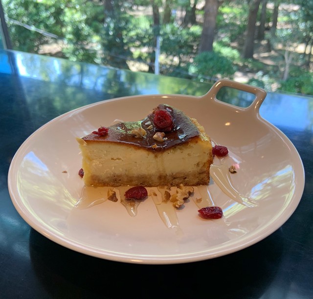 青山一丁目の草月会館2階にあるカフェ。全面ガラス張りの店内からはイサム・ノグチのデザインされた石庭と、高橋是清翁記念公園の緑の風景を眺められます。