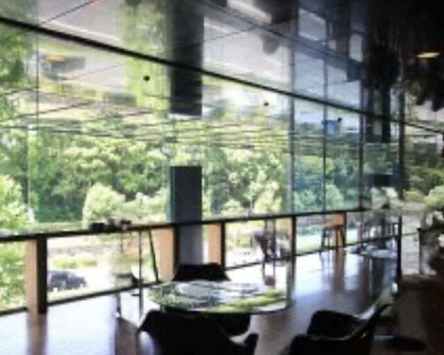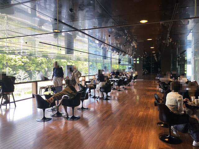 ガラス張りの大きな窓から見える木々の緑が、店内の壁やテーブルに反射していて、まるでアートの中にいるような幻想的な雰囲気。都会の中とは思えない、静かで心地よい空間です。