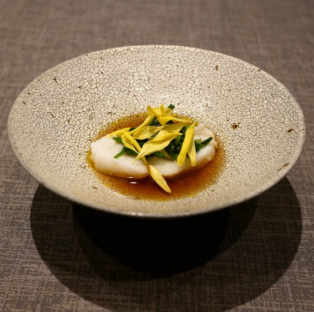 田村シェフの絶品中華を堪能したくて、またまた訪問。 今回は個室。4人で使用したのでゆったりと贅沢な空間。 いろいろなスパイスで丁寧に仕込みをされた素材が、華やかなお料理となって登場するたびに、わぁ、綺麗!と皆の笑顔が輝いて、とっても楽しい。 どれも紹興酒やワインとの相性抜群で、サービスの方のお酒や器についても説明もとても詳しくて、食事の楽しさ倍増。 特にワイングラスに注いでくれる紹興酒... 詳細を見る