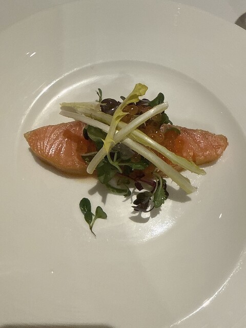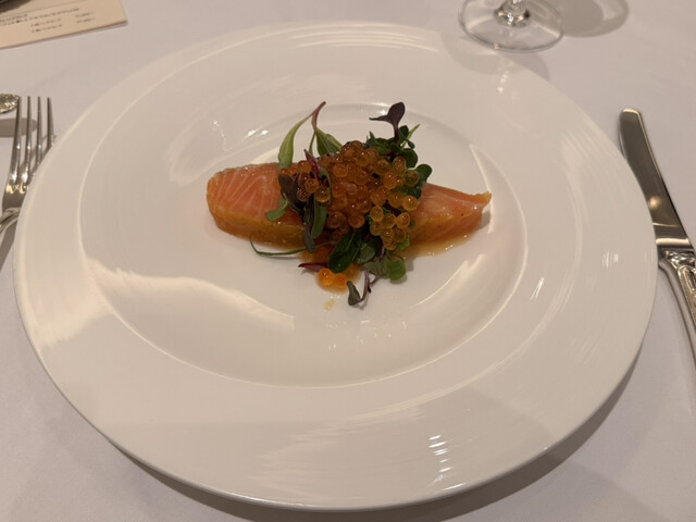スペシャリテ柑橘香るサーモンのミキュイ シャンパーニュに漬けたイクラを添えて