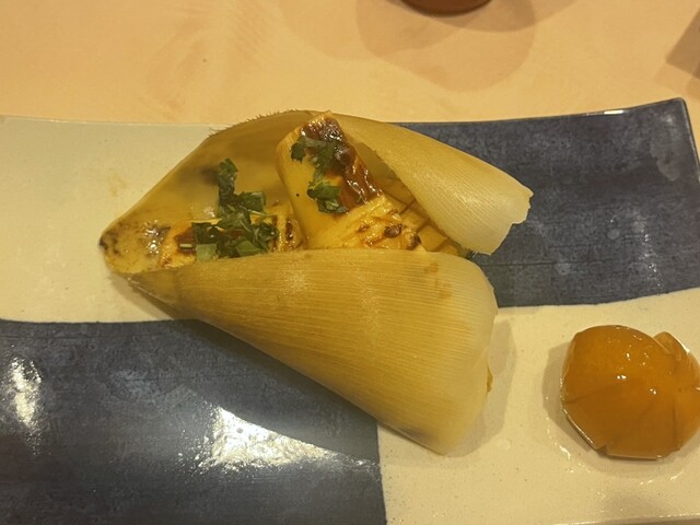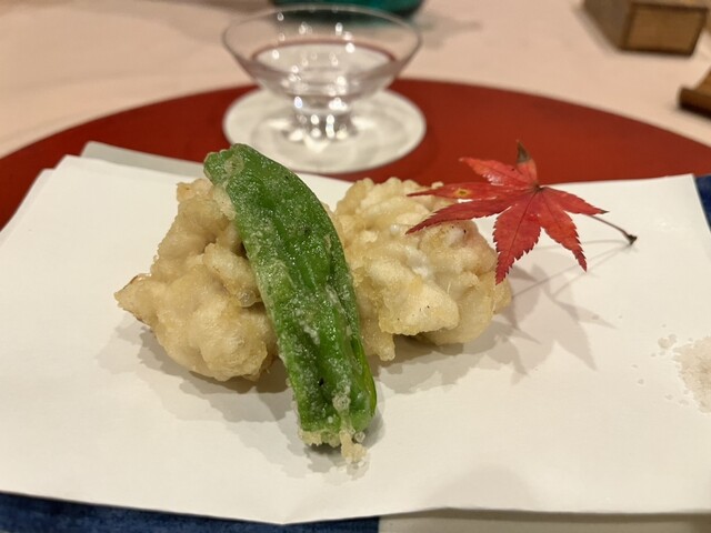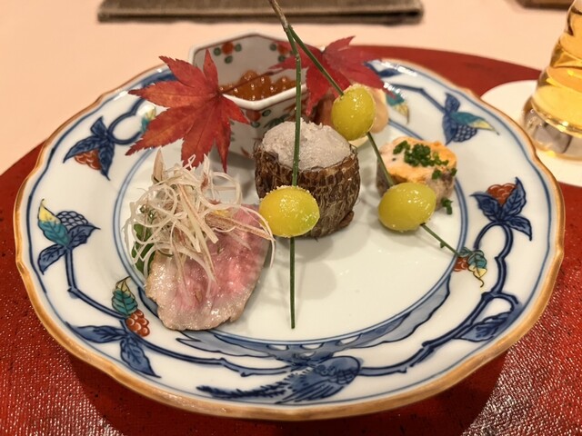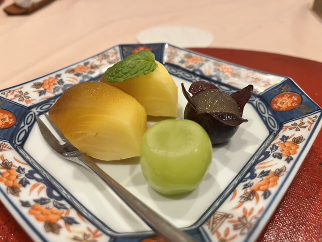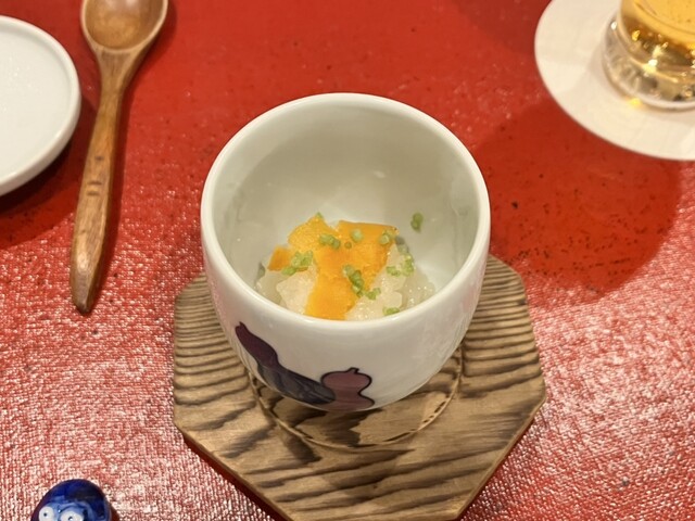 まず登場したのは、もち米の上に贅沢にからすみをあしらった一品。口に含むと、もち米のほのかな甘みとからすみの濃厚な旨味が絶妙に絡み合い、秋の訪れを感じさせてくれます。続いて、柿やいちじくなど旬の果物を中心とした盛り合わせ。彩りも美しく、目でも舌でも楽しめる一皿でした。