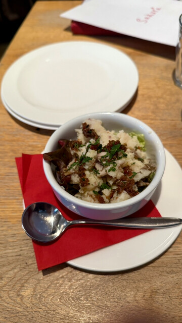 3番出口から本当に1、2分で着きます!! 駅近嬉しすぎる☺️ 同じビルにはパン屋さんやワインショップケーキ屋さんなどの系列店が入っていて、ここのレストランではそちらで扱っているパンやケーキを食べたりワインを飲んだりできます☺️ メニューは黒板メニューが季節のおすすめということで… おまかせ前菜5種盛り合わせ この日は ナスのバルサミコマリネ 鮮魚のカルピオーネ(ヒラメの南蛮漬... 詳細を見る