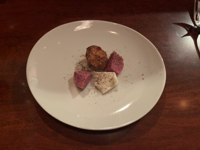 まずはワイン単体で飲んでみてくださいと言われて、少し経ってから料理を提供してくれます。ワインはソースみたいな役割で、ワインと一緒にお料理をいただくと口の中で完成する感じ。なんの料理出てくるか想像しながら待つ時間も楽しい!
