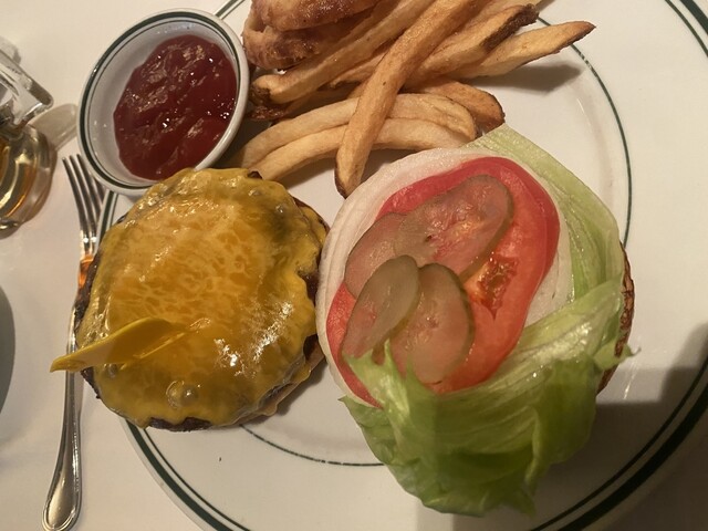 アメリカンビーフで肉厚パティと思いきや、意外と野菜やトマトがあり、パンもふんわり系であっさりしたハンバーガーだった。