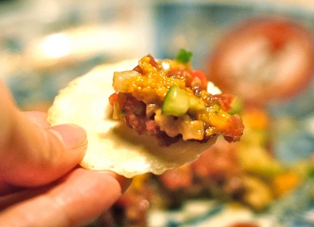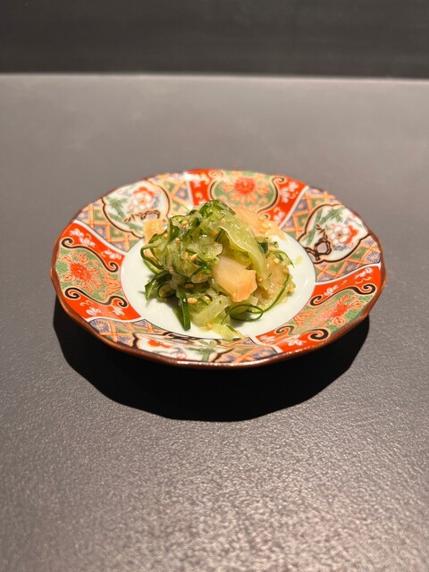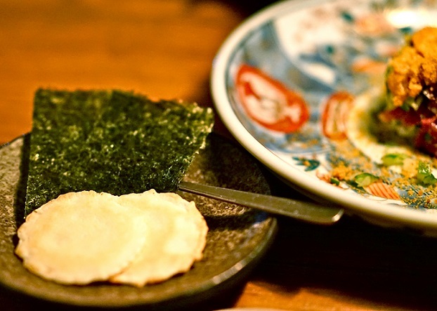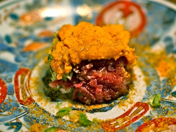 六本木駅から徒歩5分。入口ともわからない扉を開けると都会の喧騒を忘れさせるモダンな空間に誘われる。目の前で料理人が調理するのを望むことができるカウンターはわずか8席。