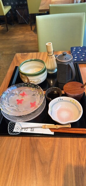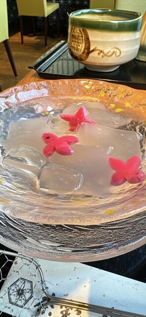 透明のカラスの器に大きなわらび餅が4つ水に浸かっています。その合間を赤い白玉粉の金魚が優雅に泳いでます。 すくうための網スプーンもオシャレ (湯豆腐で使うやつみたい。笑) な... 詳細を見る