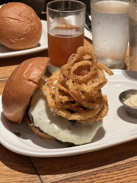 久しぶりに伺いました。お昼からハッピーアワーやってて、さすがハンバーガー屋さんらしい。昔スパークリングやワインはイマイチだった気がして生ビールとベーシックなハンバーガーを。