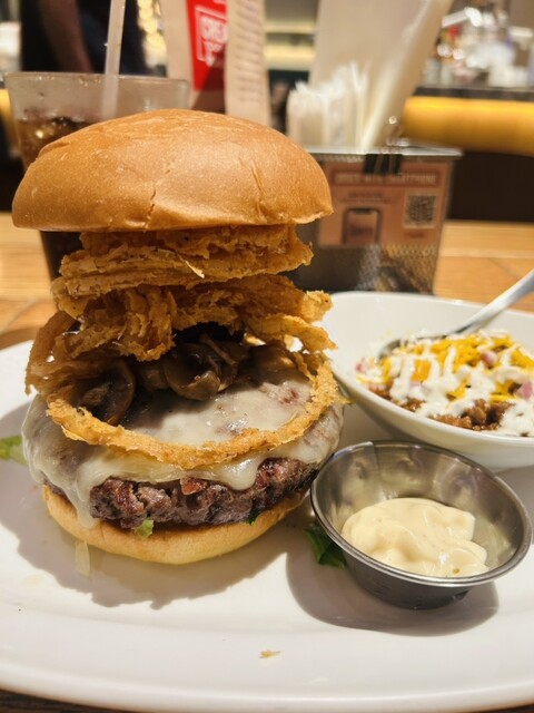 オニオンフライがざくざく入ったバーガーをたのみました