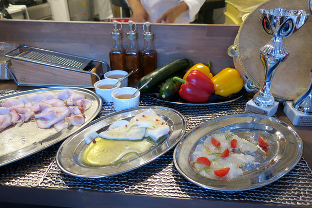 ナ、鯛のカルパッチョ、焼きナスとボッタルガ&リコッタ、中央に大き