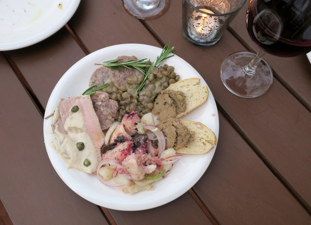 タデッラ、鰤のカルパッチョ、レバーペーストのブルスケッタ、フルーツ