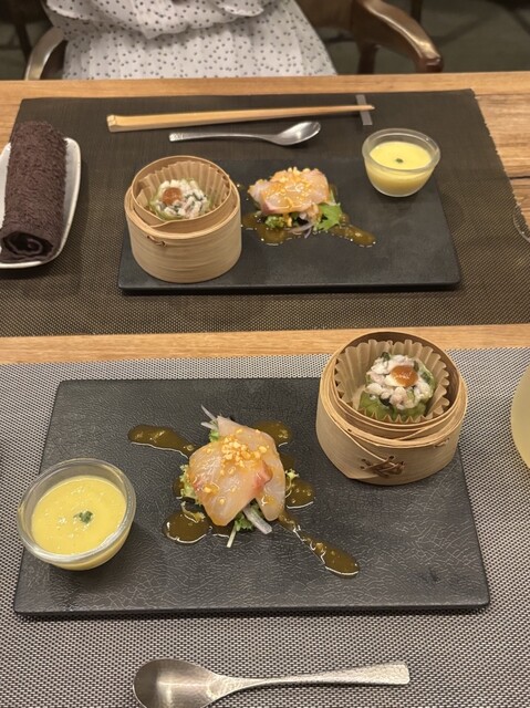 梅の焼売、レモンの爽やかなソースのかかったお刺身、冷製コーンスープ。