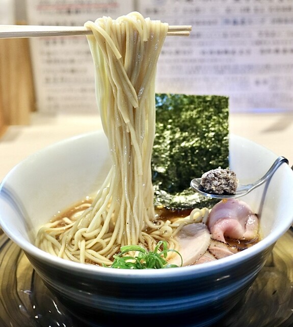 日曜昼に訪問、1時間ほどならんで入店できた。キャッシュレス決済を済ませ着席。派手で目を引く湯切りの音が心地いい。