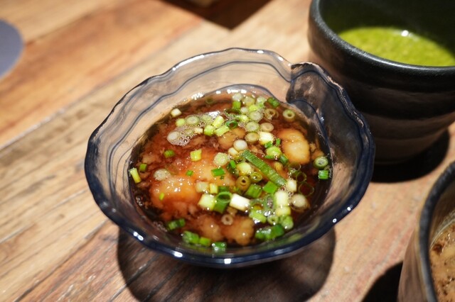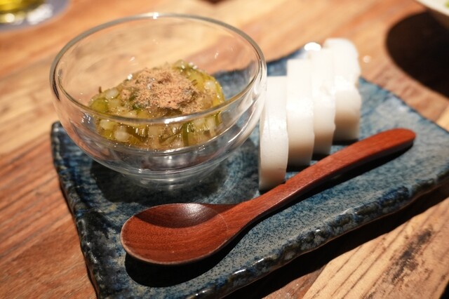 →信州産わさびとめかぶ?や鰹節が混ざっていてかなり美味しい。ワサビが苦手な人でも食べられるツーンとさ。