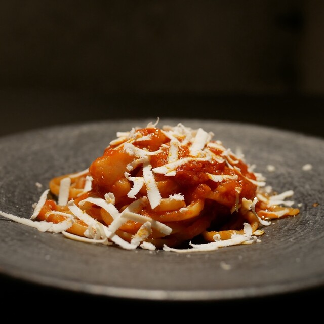 自家製平打ち麺に柔らかく煮込まれた牛ホホ肉のミートソースが美味い!