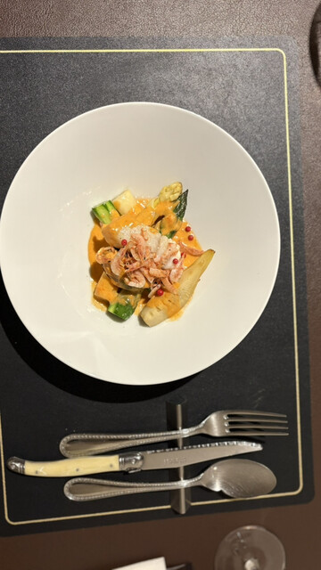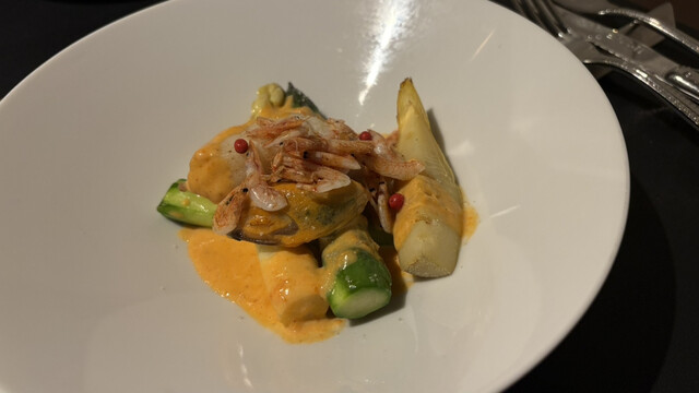 佐賀県ホワイトアスパラとグリーンアスパラのソテー、千葉県産のタケノコ添え