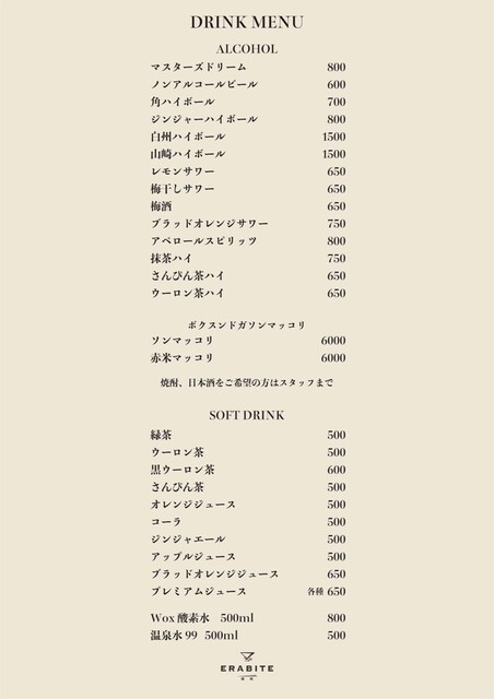 | ドリンク | 日本酒あり、焼酎あり、ワインあり、ワインにこだわる |