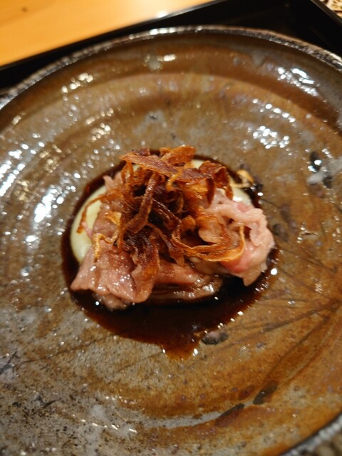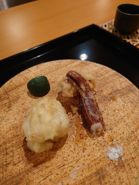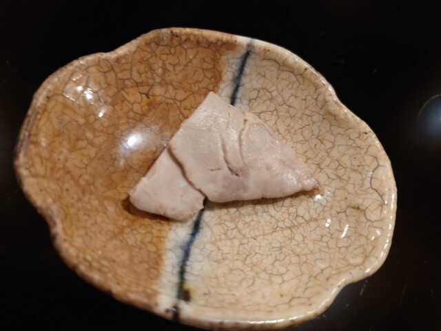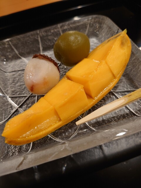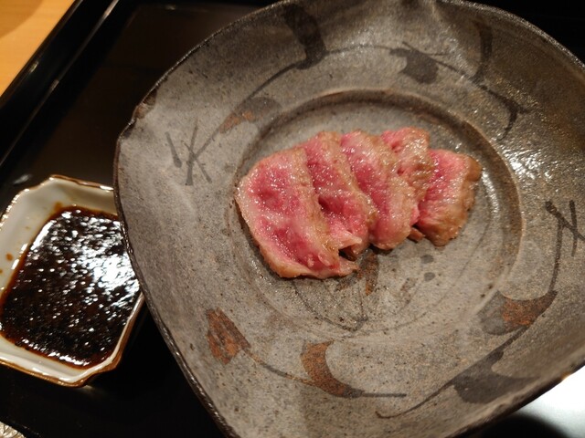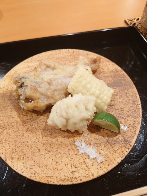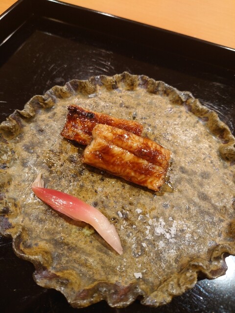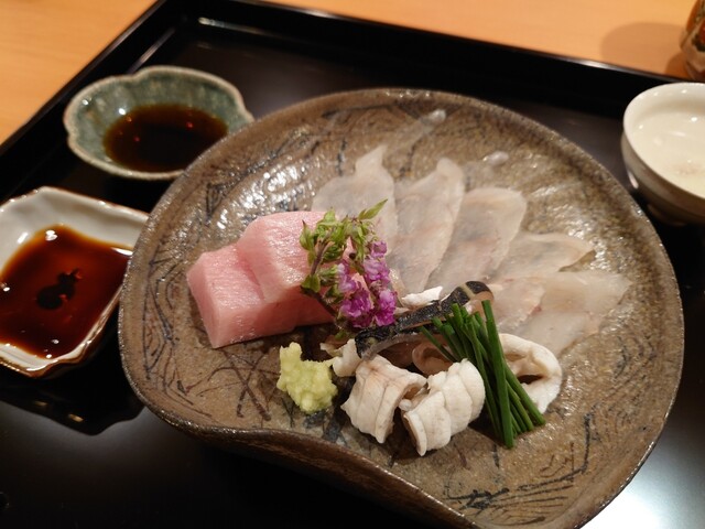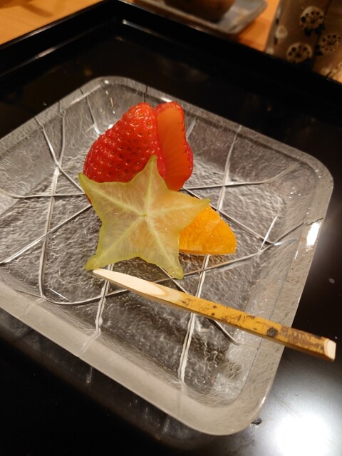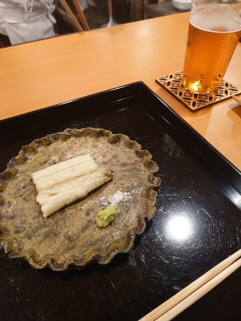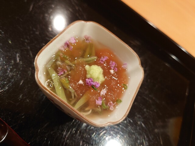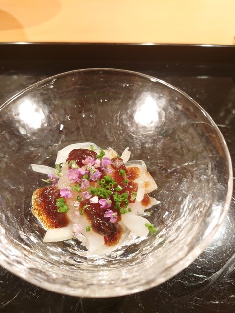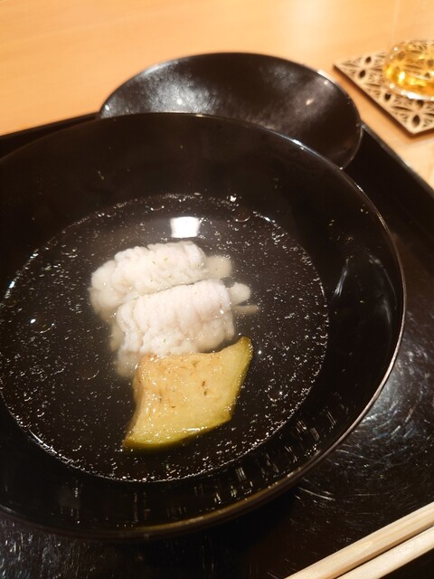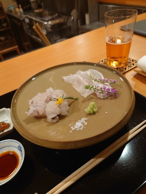 夏を楽しむコースで、鱧はお刺身、お椀、天ぷらと、色々なお料理で楽しむことができました。お刺身は初めてでしたが、皮を炭で軽く焼き、歯ごたえがあって美味でした。