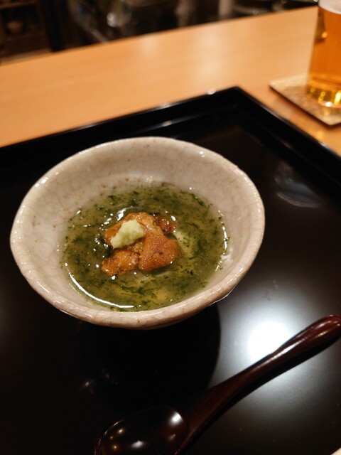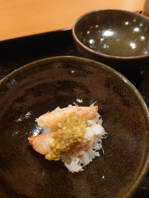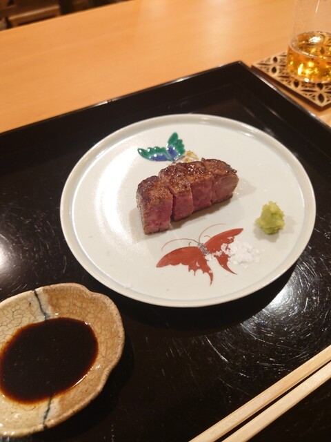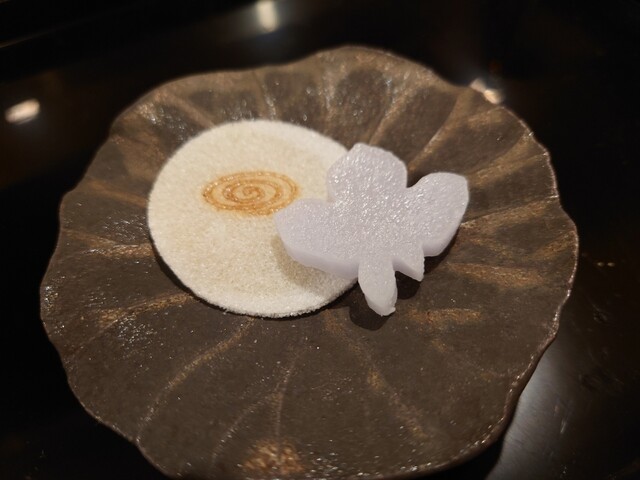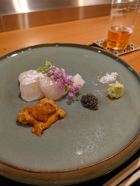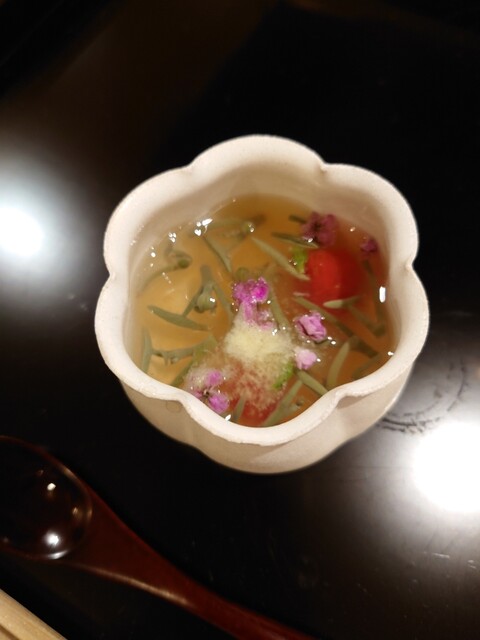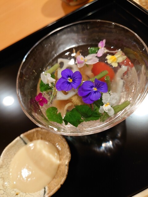 花手水に見立てたお料理が美しい✨中には赤貝やウニが。氷見の寒ブリとふぐのお造り、蟹真薯のお椀、トリュフ醤油でいただく亀岡牛のたたき、クエの天ぷら、どれも美味でした。日本酒も種類が豊富で楽しめます。