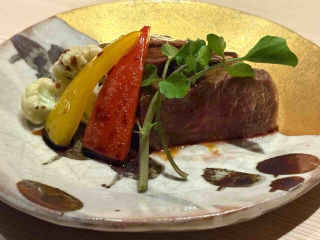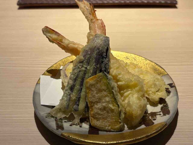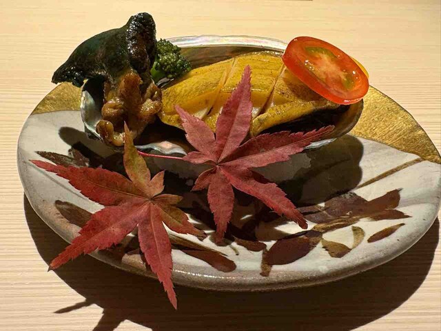 同行者が選んだのは、鮑バター焼き、福島牛ステーキ、季節の天ぷら盛り合わせ