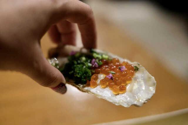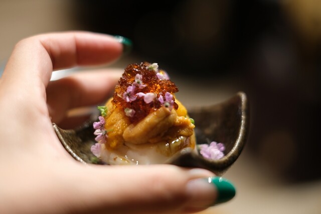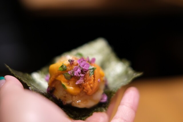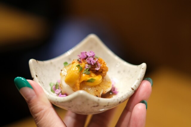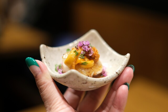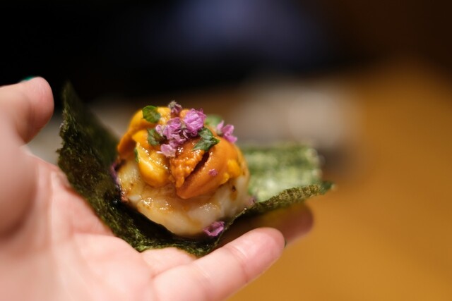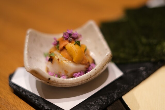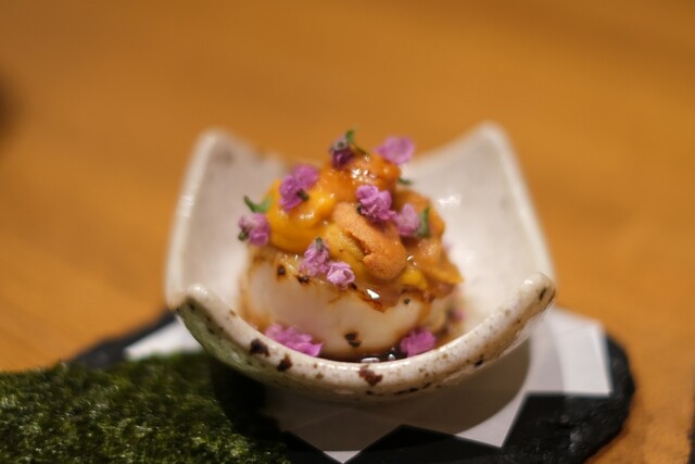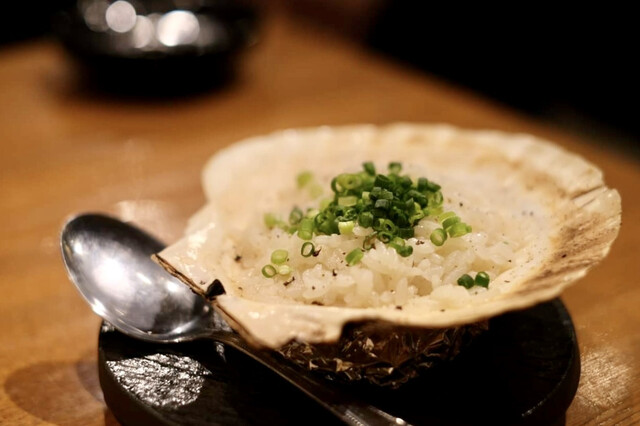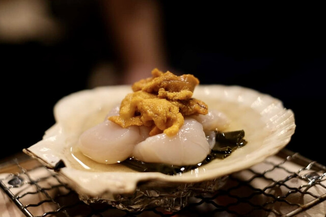 そして折角七輪を出してもらったので名物の帆立雲丹(2400円)を追加してみました。惜しげもなく盛られた雲丹は刺身でいただけるものなので焼いてる間にちょこちょこつまみ食い。レアな状態で火を通した帆立はぷりっとした歯触りが堪りません。そして後追いでやってくる雲丹の磯の香りでお口の中が大渋滞!まあ、お酒が進みました。