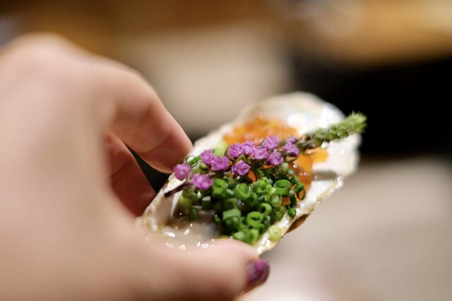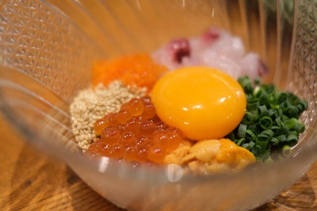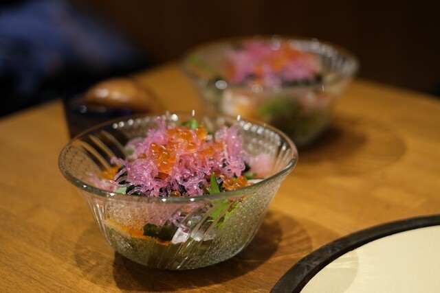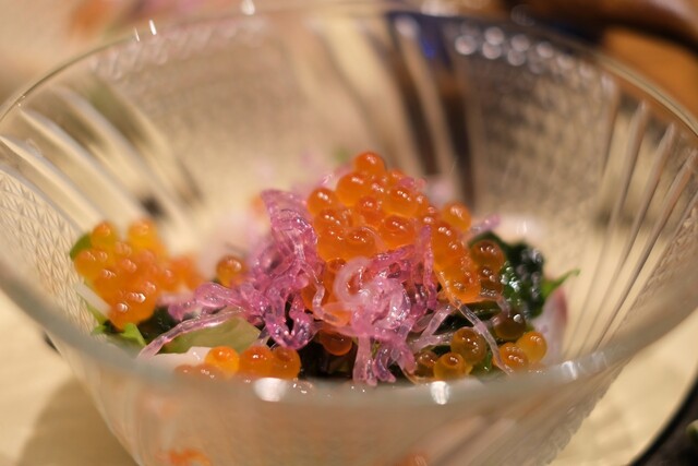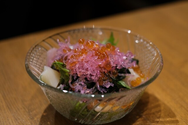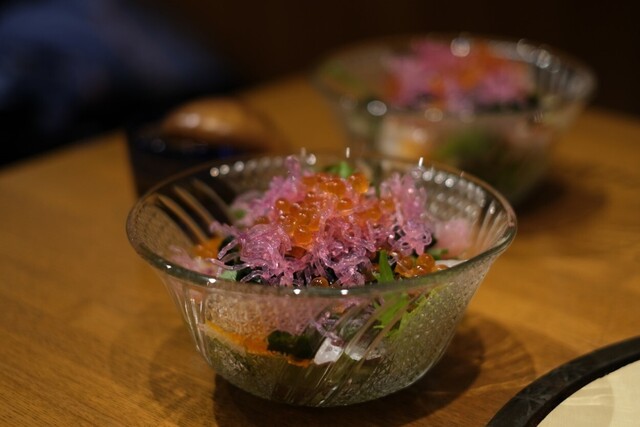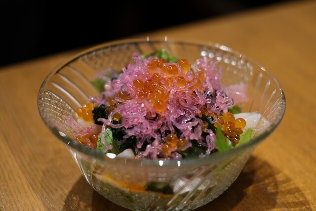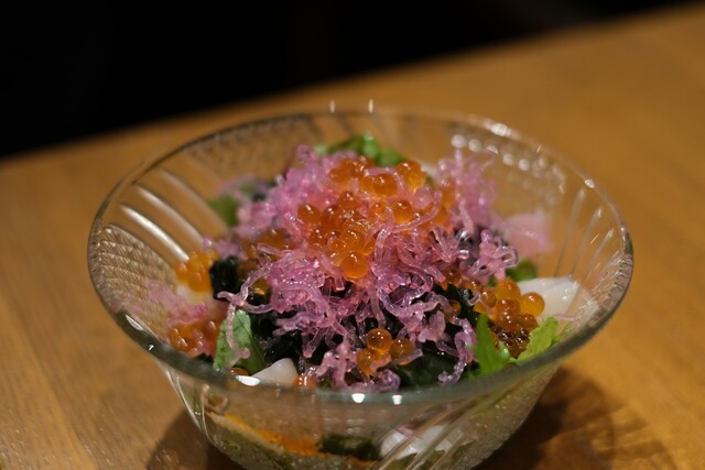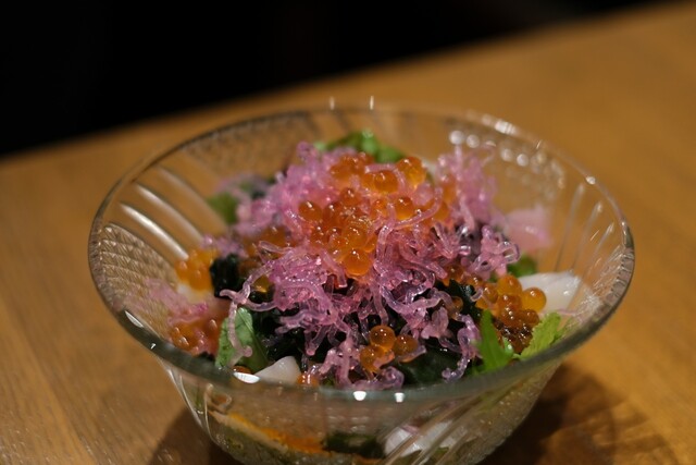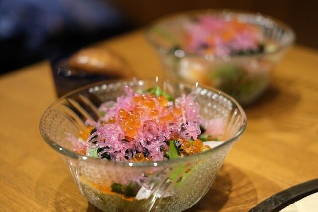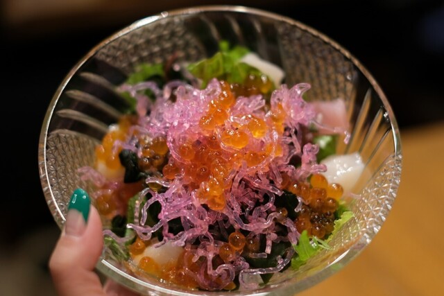 この日はサクッとした歯切れの良い胡麻カンパチにいくらがたっぷりと乗った旬魚の海鮮サラダ。シークリスタルの食感が楽しい!オリジナルドレッシングも美味。