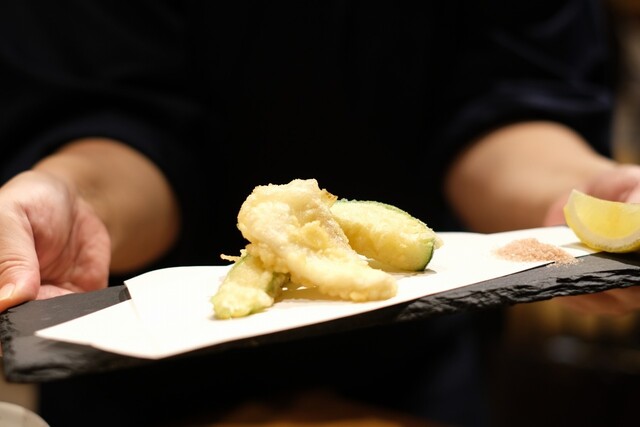 大将のスペシャリテ、帆立と生雲丹の磯部焼きはホタテの厚みに先ず驚きます。醤油ジュレにお花穂が美しい逸品!旬魚とお野菜の天麩羅はほくっとみずみずしい立派なアスパラとズッキーニ、そして真鯛。レモンを搾ってピンクソルトといただきました。