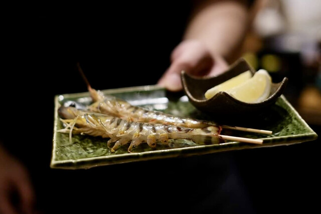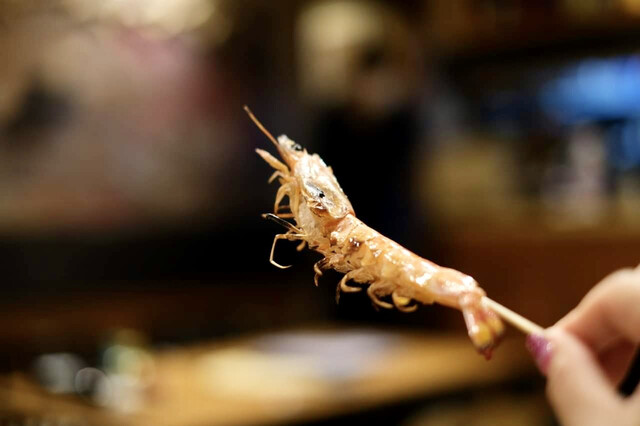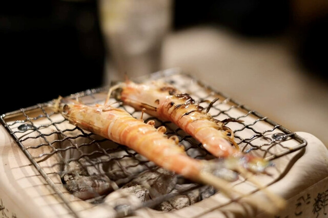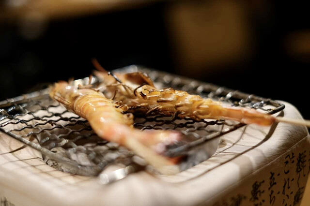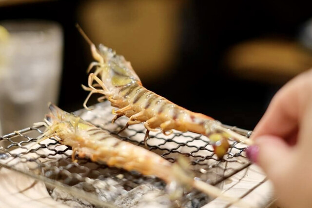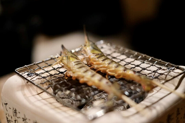 明太子の天麩羅(980円)は海苔の間に大葉が仕込まれ揚物なのにあっさりといただけるのも嬉しいですね。そしてもうひとつ、気になっていたのが七輪焼き。エントランスの生簀を元気に動き回る車海老の踊り焼きはなんと1尾480円!頭からバリバリいけちゃう鮮度抜群の海老ちゃんに感涙です。