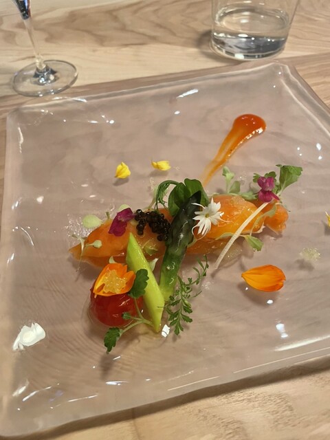 オレンジ風味のソースでマリネされパプリカのソースとキャビアが添えてあります