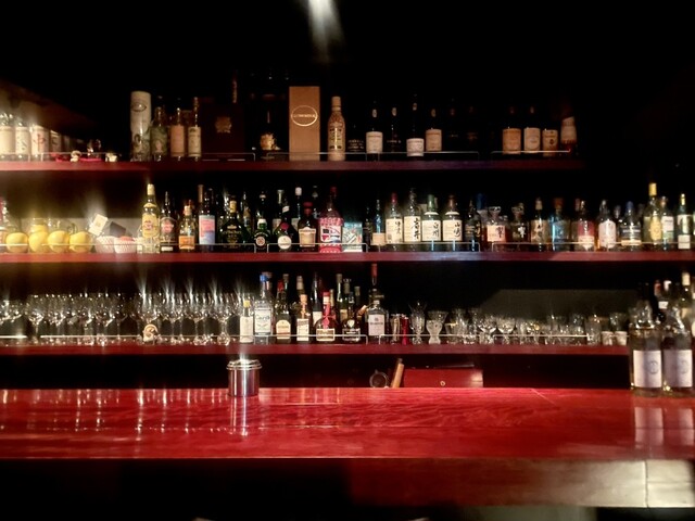 しっとりとした照明に照らされる赤いカウンター。