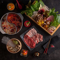 薬膳火鍋OSHIDORIのスタンダードコース 季節により変わる日々の旬の野菜と仕入れにより変わる希少な種が含まれる数十種類のきのこが魅力 火鍋の特徴でもある、白い『白湯(パイタン)スープ』と赤い「麻辣(マーラー)スープ」には良姜、草果、クコ、龍眼、なつめなど数十種類もの漢方が溶け込んでいます。中華中医薬学会が認証する国際薬膳調理師の薮崎友宏監修の元作られたスープです。