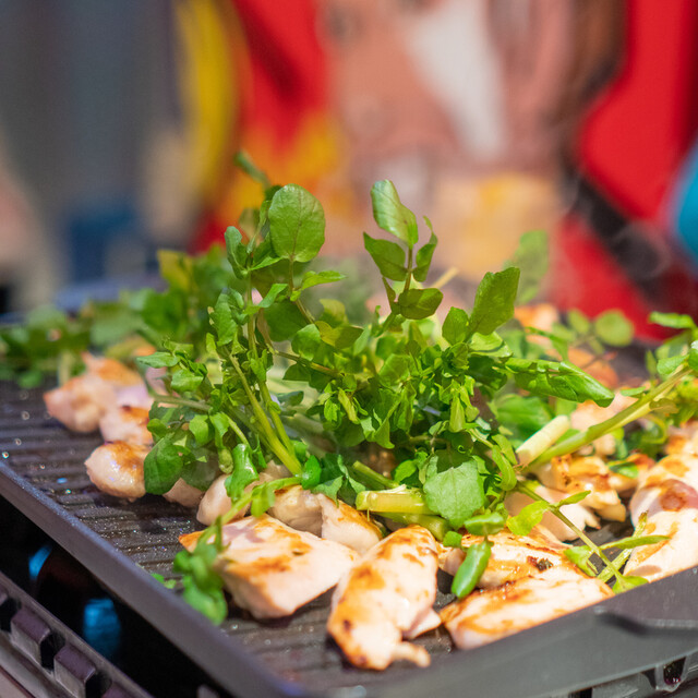 鉄板スタイルの鶏焼きはクレソンをサッと炒めて甘酢大根で巻いて食すからサッパリ!